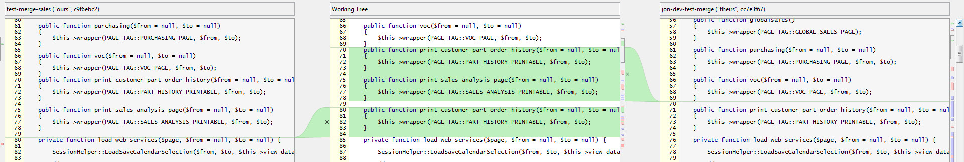 As you can see from the comments, Developer 1 adds a function - print_customer_part_order_history, followed by a second function, print_sales_analysis_page, to a given spot in the file. In parallel, the other branch has added to it a single function - print_customer_part_order_history - in exactly the same place in the file. The code is identical, including whitespace.