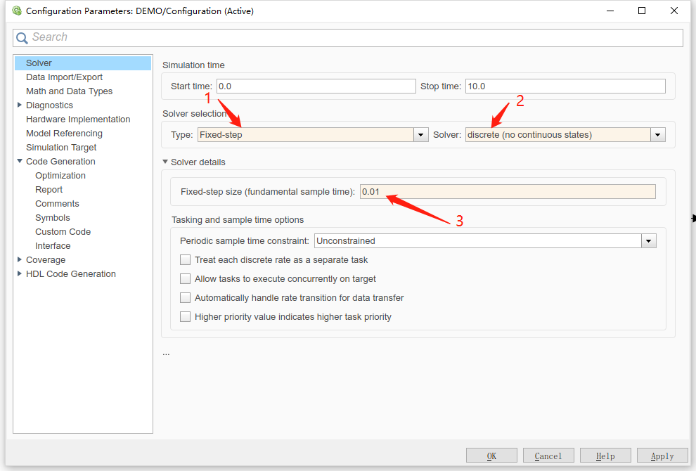 因为我们生成的代码是需要下载到单片机中的,而单片机中的计时是按照它的频率严格进行的,因此求解器中的求解步长要与单片机的步长一致,否则就会出错,所以这里将求解器类型改为定步长,离散,步长时间设置为0.01s(即10ms)。