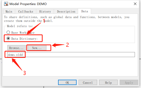 在Data Dictionary或Base Workspace里定义同名的信号对象(这里推荐使用Data Dictionary,因为数据字典会使用一个专门的文件进行信号的管理,下同)。在Model Explorer里,选中Data Dictionary或Base Workspace,然后添加三个Simulink Signal,并改名为x、y、z,设置x、y的Storage Class为ImportedExtern,将z 设置为ExportedGlobal;