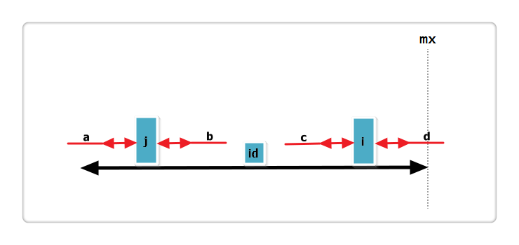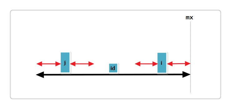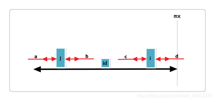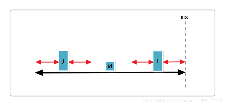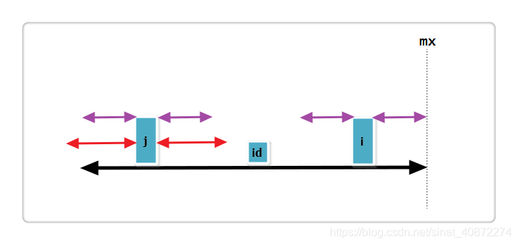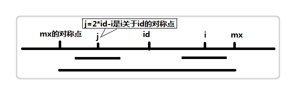 首先对变量给出解释:id为已经确定的一个最长回文子串的中点, i 和 j 为两个关于id对称的最长回文子串的中点,mx为id回文串的最右端点。