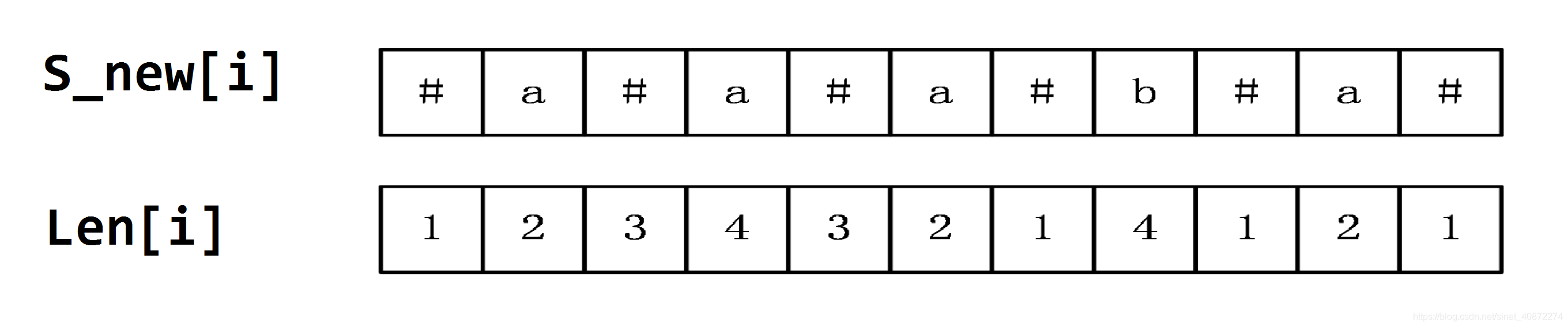 证明:首先在转换得到的字符串str中,所有的回文字串的长度都为奇数,那么对于以s_new[i]为中心的最长回文字串,其长度就为2*Len[i]-1,经过观察可知,s_new中所有的回文子串,其中分隔符的数量一定比其他字符的数量多1,也就是有Len[i]个分隔符,剩下Len[i]-1个字符来自原字符串,所以该回文串在原字符串中的长度就为Len[i]-1。