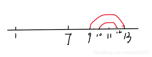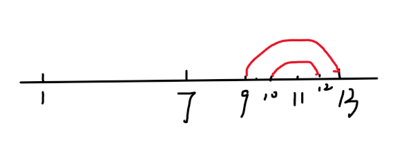 对于算法2我们会枚举每一个位置的中点,每次都从枚举点开始向两端拓展。比如下图中枚举了7作为中点,假设其两端最远拓展的长度为6,即字符串[1~13]为一个回文子串(并且13为当前向右拓展的最远距离)。当我们再枚举11作为中点时,我们会依次比较:(10,12)->(9,13)->......,这样的复杂度就是O(n^2)。然而实际上我们还需要对7为中点的子串进行这样的枚举吗?