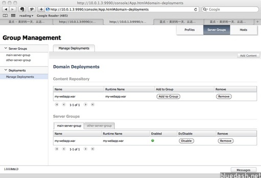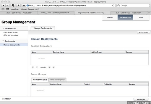 可以看到,管理页识别出AS7正运行在domain模式之下,并且目前共有两台主机运行(左上角的列表分别列有master及slave)。我们要关注的是server-group:点击右上角的"Server Groups",进入服务器组的管理页面,然后点击左边的"Manage Deployments"页面,进入部署功能页面: