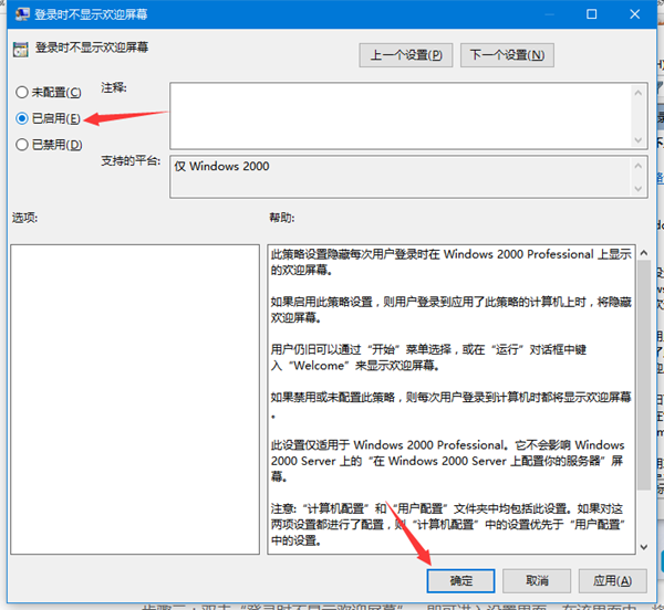 5.3、 双击打开“登陆时不显示欢迎界面”,勾选“已启用”,然后点击“确定”保存退出即可,再次开机时就不会显示开机界面,而是直接进入桌面了