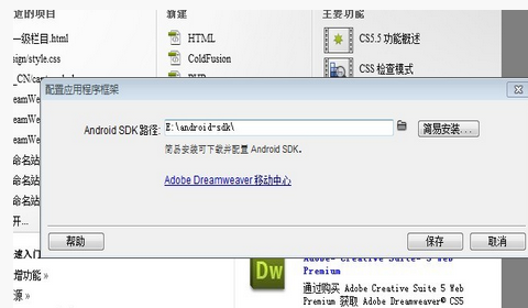 、安装 Android SDK 该步骤安装Android模拟器,程序可在模拟器中运行。点击“站点-》移动应用程序-》配置应用程序框架”,弹出对话框见下图: