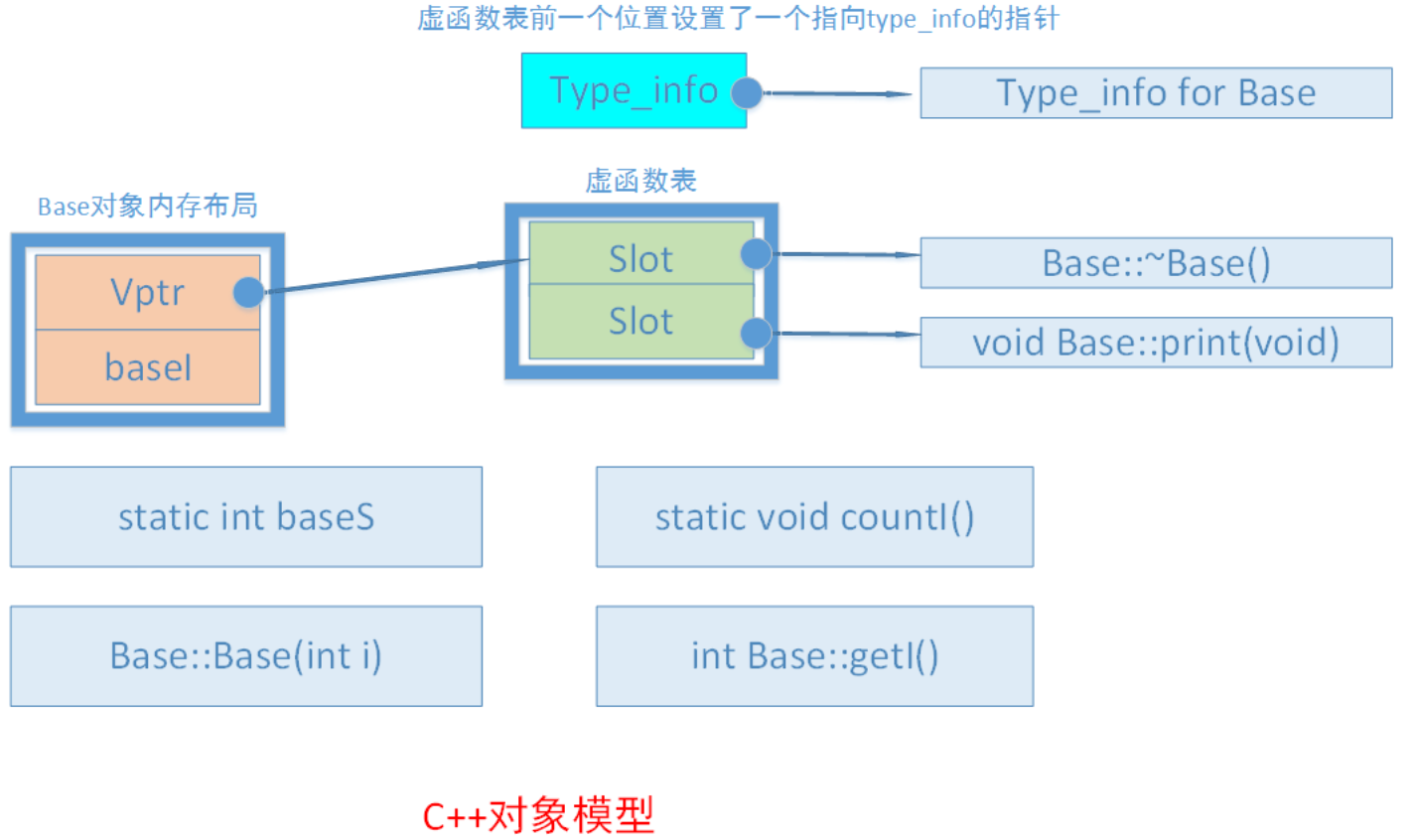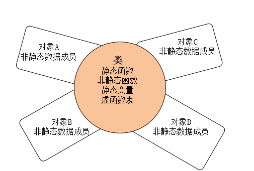 另外,虚函数表的前面设置了一个指向type_info的指针,用以支持RTTI(Run Time Type Identification,运行时类型识别)。RTTI是为多态而生成的信息,包括对象继承关系,对象本身的描述等,只有具有虚函数的对象在会生成。- 圆圈代表类中可以供每个对象共享的部分,矩形表示每个对象自己含有的部分。