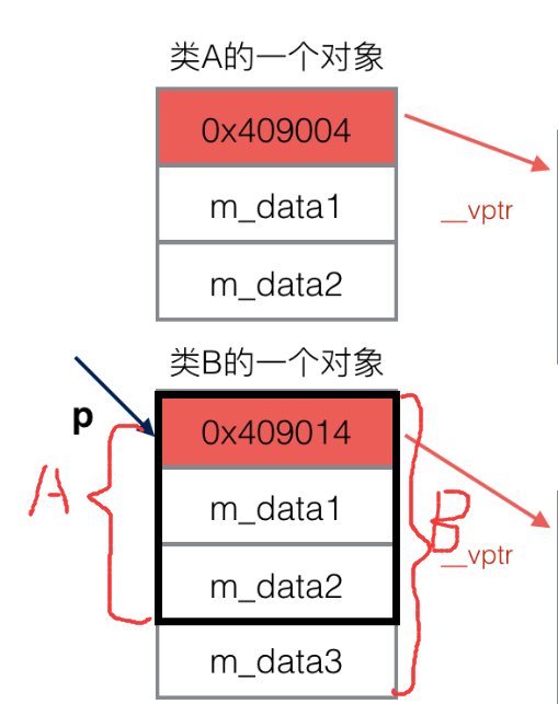 《-------》 指针p是基类A*类型,但是*__vptr也是基类的一部分的理解。