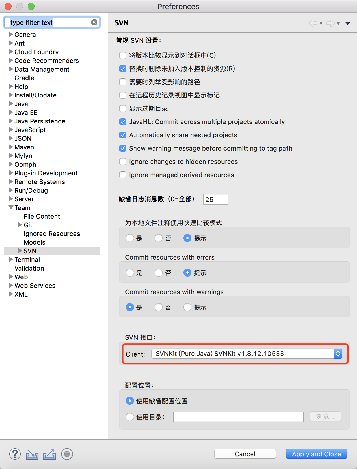 环境是mac: eclipse---->偏好设置----->team ----->svn --- svn页面有一个(svn接口)把client端的JavaHL(JNI) No Available换成SVNKit(pure Java).....就好了