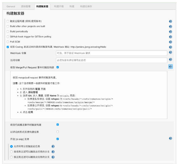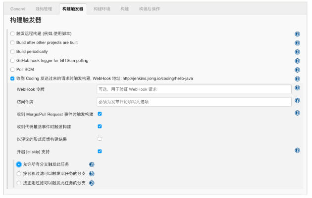 在构建触发器栏中选择『收到 Coding 发送过来的请求时触发构建』,并填入相应的选项。