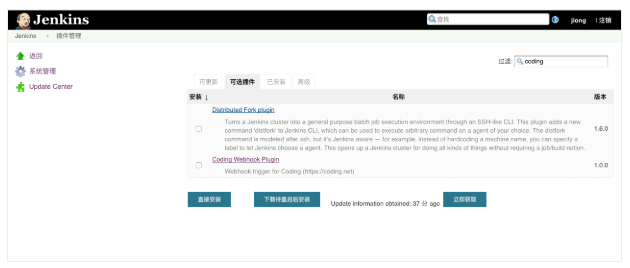 选择『可选插件』,在右上方 『过滤』框中,输入『coding』,即可看到『Coding Webhook Plugin』。 勾选后,点击下方的『直接安装』。如果没有搜索到结果,可以点击右下方的『立即获取』,获取后即可看到。
