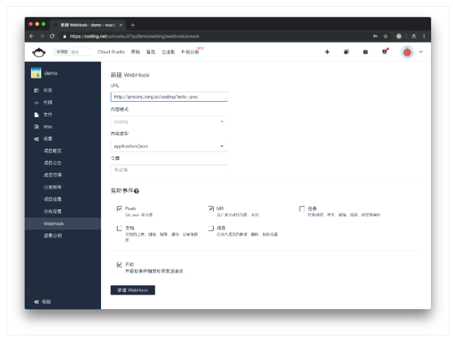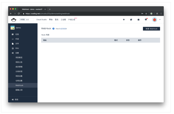 回到 Coding 中,在项目的设置中选择添加 Webhook。