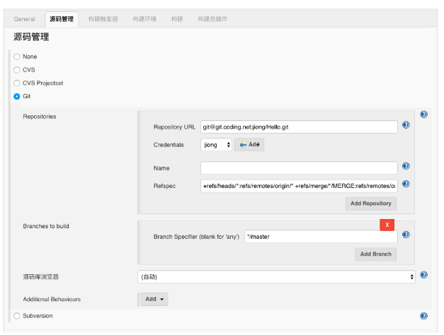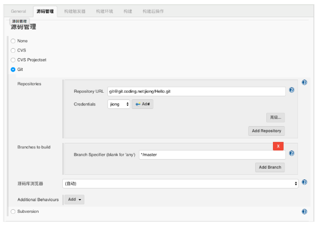 进入项目配置页面,在源码管理下选择 Git,并填入项目地址,以及认证的形式。