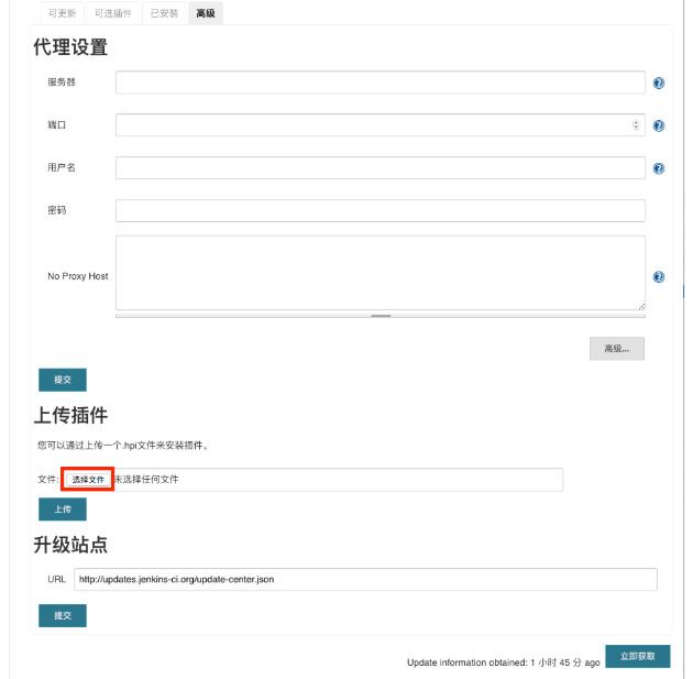 在『高级』标签下,上传插件栏中点击选择文件,选中 coding-wehook.hpi