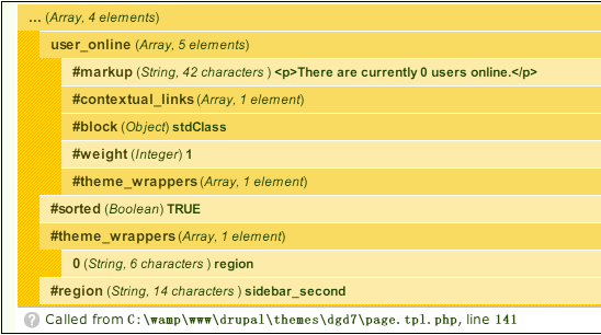 An easy way to identify arrays as render elements is the presence of properties. Render elements are always arrays, and they always contain properties that always begin with a hash tag. In Figure 16–4, you can immediately tell that $page['sidebar_first'] is a render element because it contains a few properties: #sorted, #theme_wrappers, and #region. These properties are used by drupal_render() which is called when using drupal_render() to determine how to render the output. For details about drupal_render() see http://api.drupal.org/api/function/render/7.