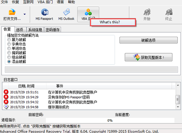 在某些情况下,Advanced Office Password Recovery不能够恢复密码或将其显示出来,就可以选择更改或删除密码以达到打开文件的目的。 比如使用Advanced Office Password Recovery恢复Project密码时,便可以立即恢复打开和修改密码,但只能更改或删除VBA密码。