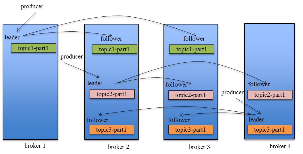 引入Replication之后,同一个Partition可能会有多个Replica,而这时需要在这些Replication之间选出一个Leader,Producer和Consumer只与这个Leader交互,其它Replica作为Follower从Leader中复制数据。