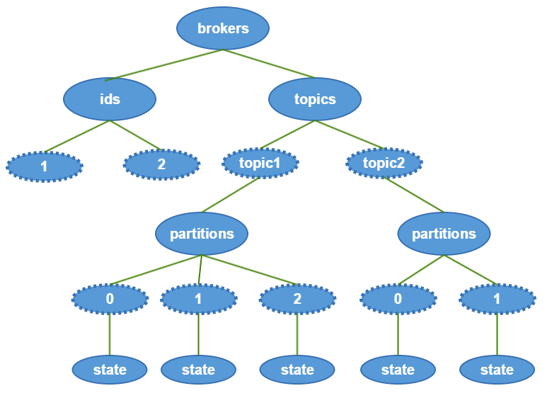 topic注册信息(/brokers/topics/[topic]),存储该topic的所有partition的所有replica所在的broker id,第一个replica即为preferred replica,对一个给定的partition,它在同一个broker上最多只有一个replica,因此broker id可作为replica id。数据结构如下: