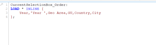 步骤: 1、在所有脚本开始的位置创建一个INLINE Table,将所有想要排序的字段放到这个表中,如果有字段中包含空格,可以使用''将字段包裹起来 2、在所有脚本的最后将这个INLINE Table删除掉 具体示例如下: 来源:https://www.cnblogs.com/rui-yang/p/11899748.html 标签 qlikview