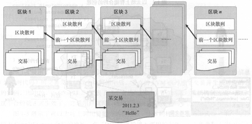 如下图,如果在区块3的交易列表中查找到历史某一时刻记录的交易内容“ Hello ”,则可以证明该交易发生在区块3所代表的时间片段。 每个时间点都能得到证明,因此一个事件的来龙去脉就可以得到证明(“溯源”)。 因此,很多应用, 如食品的处理、加工、运输流程可以在区块链历史数据上进行验证,再如将证书、资格认证一类的数据记录在区块链上也可以证明自己的资历。