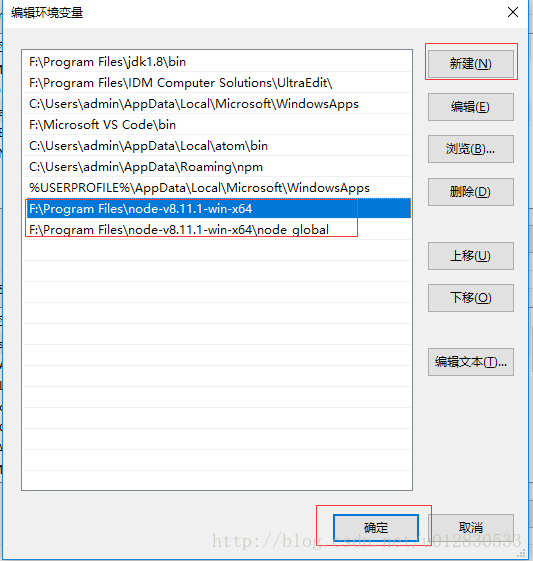 3.复制node_global目录路径(F:\Program Files\node-v8.11.1-win-x64\node_global)后选中用户变量中的Path,单击’编辑’- ->’新建’- ->输入刚复制的地址 - ->确认完成。