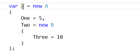 var a = new A {One = 5, Two = new B {Three = 10}};