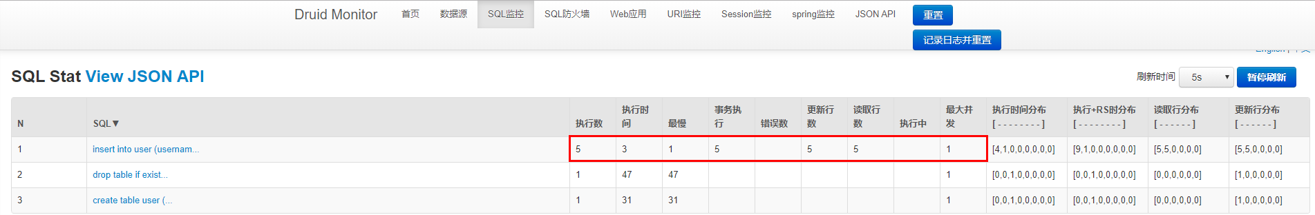 看日志,JPA是先把所有的数据全查出来了,如果数据库有就更新,没有就新增。我们访问 http://localhost:8080/druid/login.html 输入账户名root,密码admin登录,看一下阿里Druid的SQL监控:
