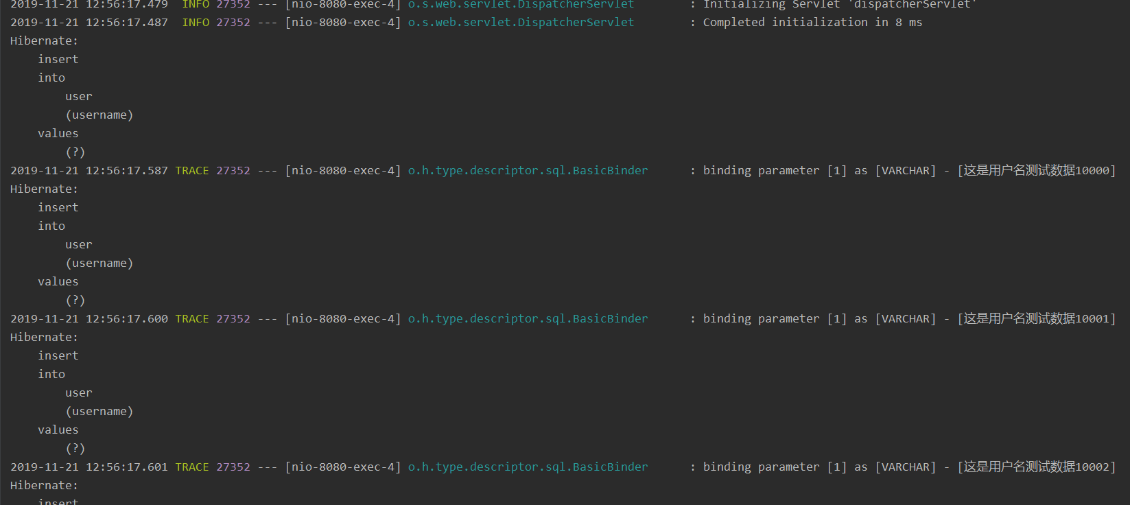 user.setUsername("这是用户名测试数据" + i);