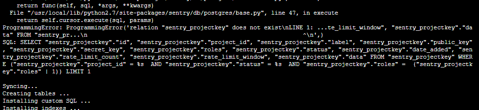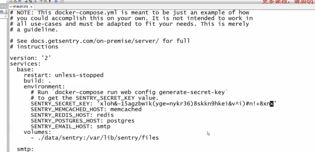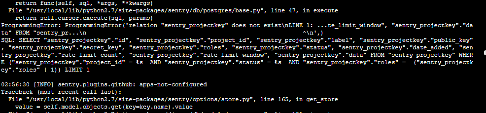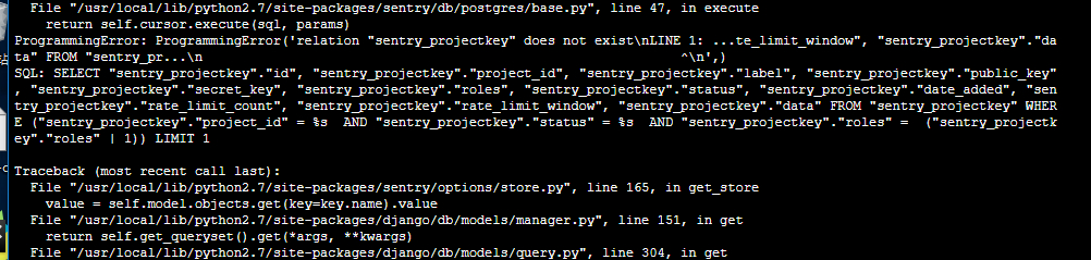 7.启动sentry(上一行得到secret-key,然后把key复制到下面四行的单引号中)