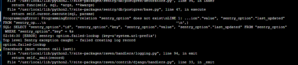 1.centos7下搭建sentry错误日志服务器:http://projectsedu.com/2016/10/14/centos7%E4%B8%8B%E6%90%AD%E5%BB%BAsentry%E9%94%99%E8%AF%AF%E6%97%A5%E5%BF%97%E6%9C%8D%E5%8A%A1%E5%99%A8/