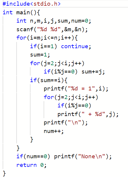 逐行输出给定范围内每个完数的因子累加形式的分解式,每个完数占一行,格式为“完数 = 因子1 + 因子2 + ... + 因子k”,其中完数和因子均按递增顺序给出。若区间内没有完数,则输出“None”。