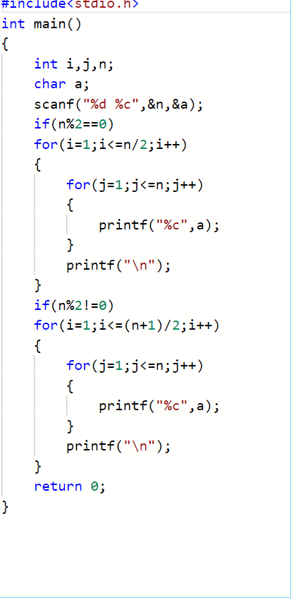 输出由给定字符C画出的正方形。但是注意到行间距比列间距大,所以为了让结果看上去更像正方形,我们输出的行数实际上是列数的50%(四舍五入取整)。