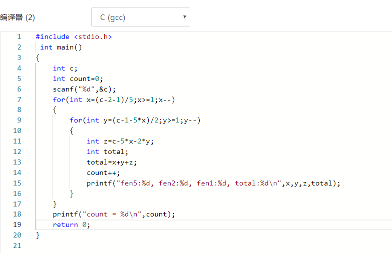 for(int y=(c-1-5*x)/2;y>=1;y--)//2分硬币个数