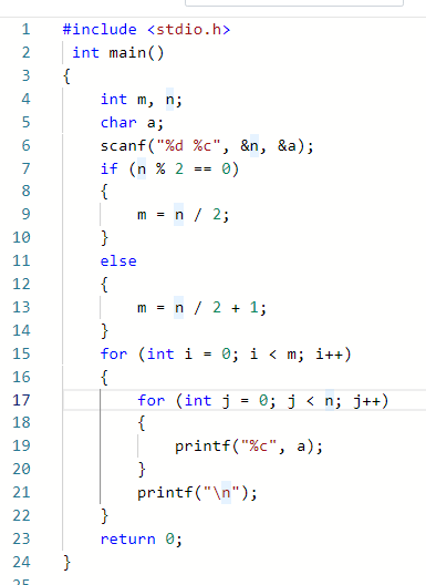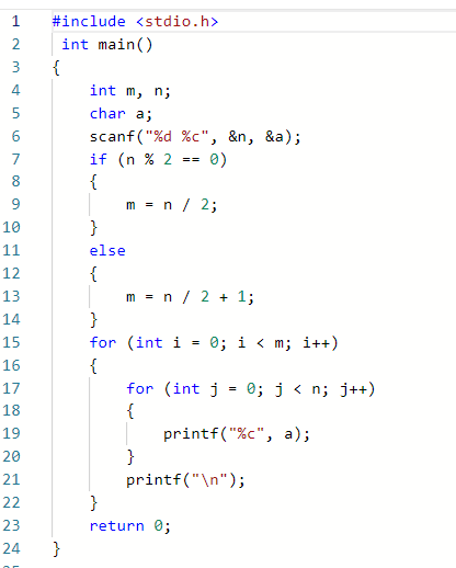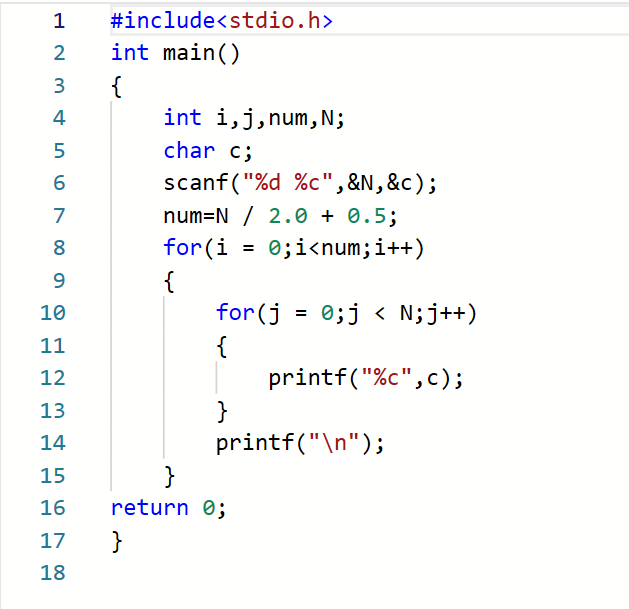 输出由给定字符C画出的正方形。但是注意到行间距比列间距大,所以为了让结果看上去更像正方形,我们输出的行数实际上是列数的50%(四舍五入取整)。