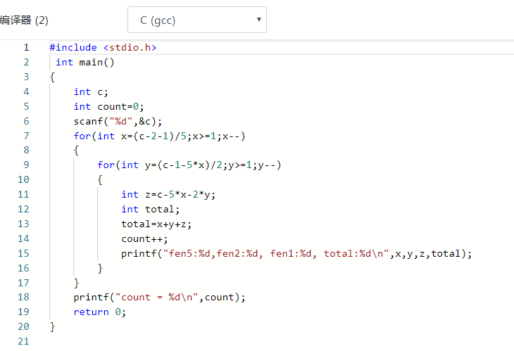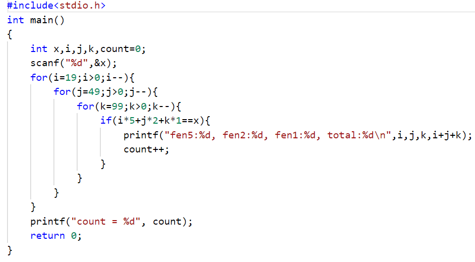 要求按5分、2分和1分硬币的数量依次从大到小的顺序,输出各种换法。每行输出一种换法,格式为:“fen5:5分硬币数量, fen2:2分硬币数量, fen1:1分硬币数量, total:硬币总数量”。最后一行输出“count = 换法个数”。