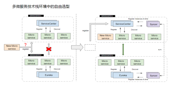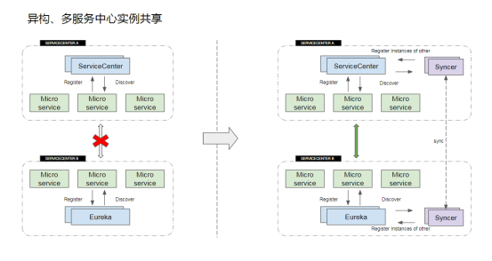 上图左,两套服务中心(ServiceCenter 和 Eureka)各自为政,各自辖区的服务无法跨越架构边界,无法发现对方服务实例,从而无法进行通讯。上图右,两套服务中心的实例将通过 Syncer 同步,在两个服务中心里,最后都将呈现出所有的实例,服务之间无障碍发现,从而实现实例的共享通讯。