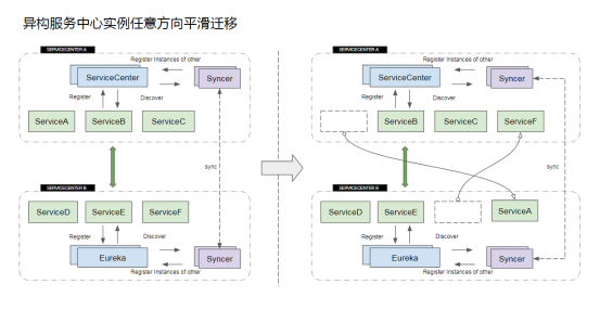 - 支持异构服务中心实例任意方向的平滑改造迁移