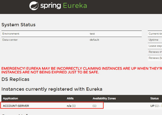 此时打开http://10.0.0.10:8761,可以看到AccountServer已经注册成功