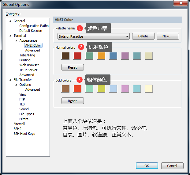 option->Global options –> Terminal->Apperance->ANSI Color 注意: 1:不同版本可能不一致,当前版本Version 8.3.2 (x64 build 1584) 2:在session options->terminal->emulation 勾选了asi color 和 user color scheme 来源:https://my.oschina.net/u/4193646/blog/3132799 标签 SecureCRT