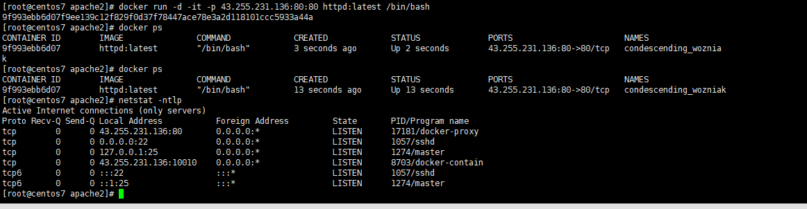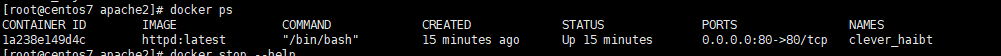 [root@centos7 ~]# docker run -itd -p 0.0.0.0:80:80 --name apache docker.io/ubuntu /bin/bash
