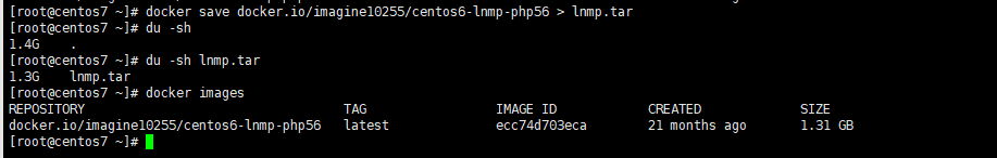 [root@centos7 ~]# docker save docker.io/imagine10255/centos6-lnmp-php56 > lnmp.tar