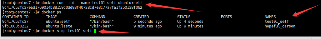 [root@centos7 ~]# docker run -itd --name test01_self ubuntu:self 用提交的镜像再启动新的镜像