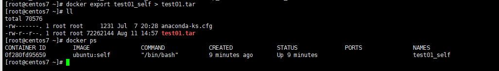 [root@centos7 ~]# docker export test01_self > test01.tar