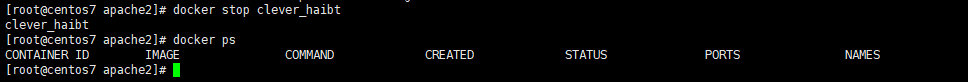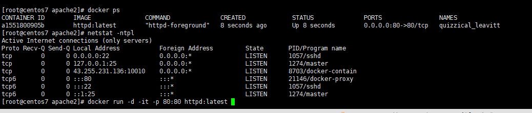 [root@centos7 ~]# docker run -d -it -p 80:80 clever_haibt_new:latest /bin/bash