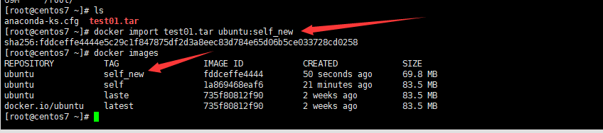[root@centos7 ~]# docker import test01.tar(镜像包) ubuntu:self_new(新的镜像名)
