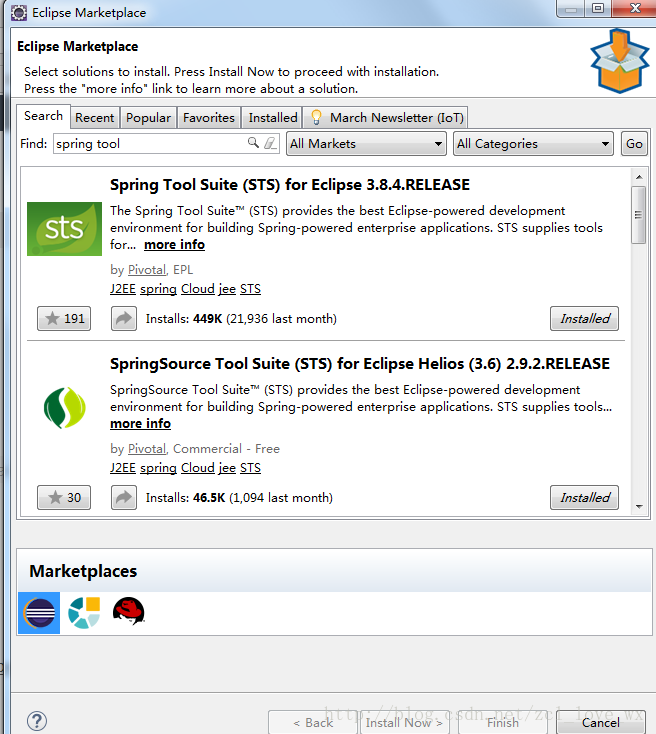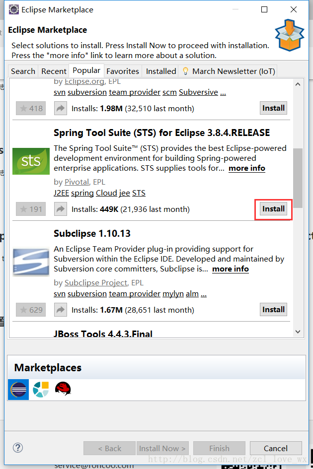2.选择“Popular”标签去查找Spring Tool Suite (STS) for Eclipse插件,找到后在线安裝