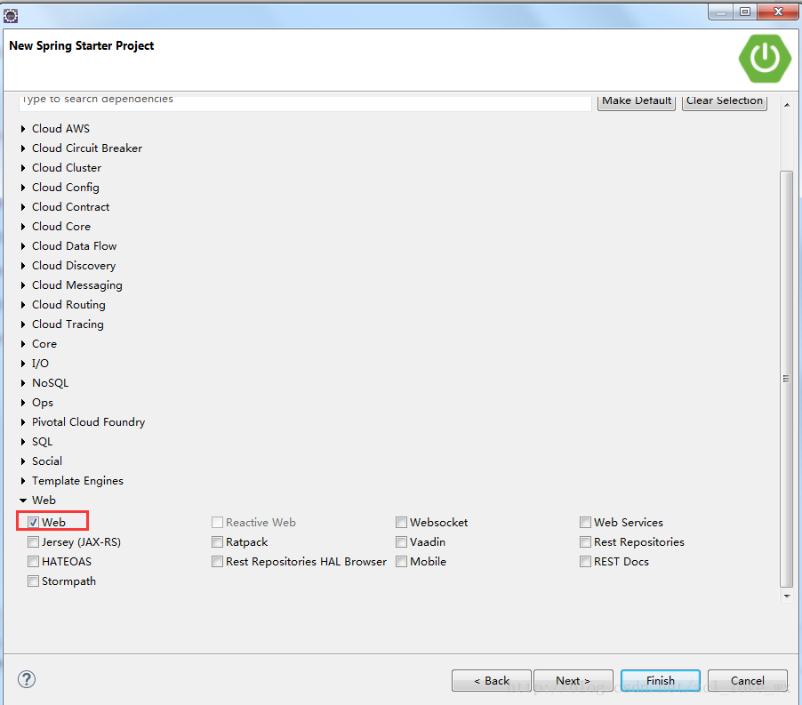 四、选择需要的Dependency(我这里只选了Web,选得越多,下载越耗时)。然后Finish: