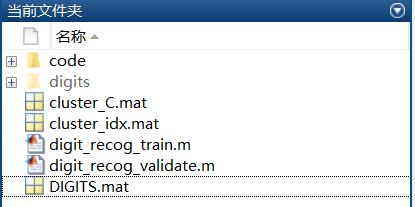 源文件digit_recog_train.m和digit_recog_validate.m分别为训练代码和验证代码,本别实现本博客第2章“算法原理”中的S1和S2的功能。其他三个.mat文件都是所需数据包,DIGITS是上述20个.mat数据包的集合(为了方便后续代码的书写),cluster_C.mat和cluster_idx.mat分别是函数mykmeans.m的前两项返回值,详情请见实验“算法|k-means聚类”。