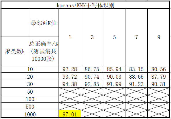 2-在实验所取得数据范围内,当k=1000,K=1时,0-9数字手写体整体识别正确率最高,达到了97.01%。