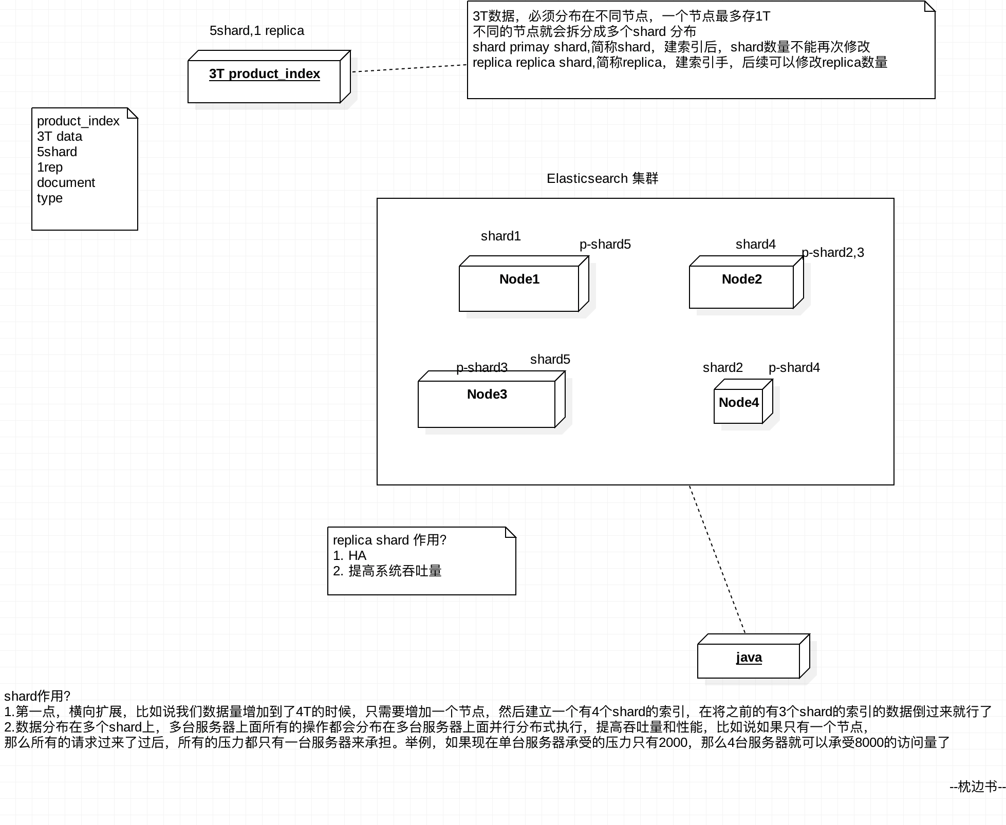 - primary shard不能和自己的replica shard放在同一个节点上(否则节点宕机,primary shard和副本都丢失,起不到容错的作用),但是可以和其他primary shard的replica shard放在同一个节点上