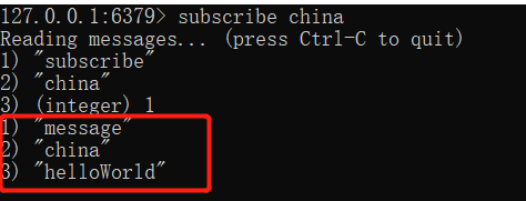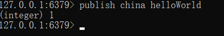 - 然后再开启一个redis-cli(P1),并向china这个channel发布helloWorld消息